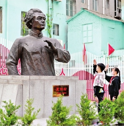 两名学生向屹立在夏明翰小学操场上的夏明翰烈士雕像敬少先队礼。