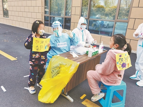 楚天都市报极目新闻讯(记者曹洋 通讯员谢靖 陈秋霞)4日,在上海新浦江城小区核酸采样点,两个小女孩的“背背贴”特别引人关注,因为上面写着“谢谢,大白”“加油上海”。