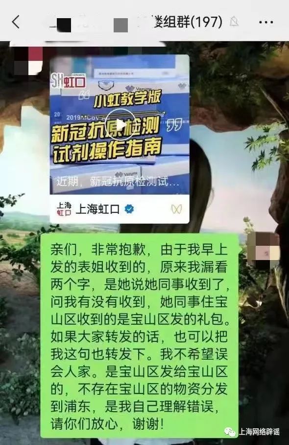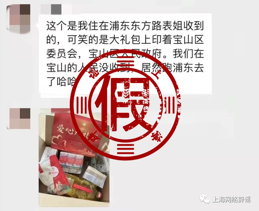 近日,网传热议一组“宝山个别街镇抗疫物资发放不均问题”的微信聊天记录。对话中一网友提到,“这个是我住在浦东东方路表姐收到的,可笑的是大礼包上印着宝山区委员会,宝山区人民政府。我们在宝山的人民没收到,居然跑浦东去了”,并配发了一张大礼包图片,该图片上却有宝山区字样。不少粉丝留言希望上海辟谣平台求证。