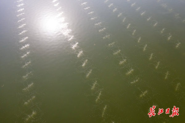 碧朗晴空下的汤逊湖格外动人,子湖红旗湖湖面上分布着16个头戴“小黄帽”的蓝色涌浪机,不停歇地转圈圈,荡起一圈圈的金色涟漪,让湖面变身欢乐的“水世界”。远离岸边的几处涌浪机,身边“陪伴”着光伏板,实现能源“自给自足”。