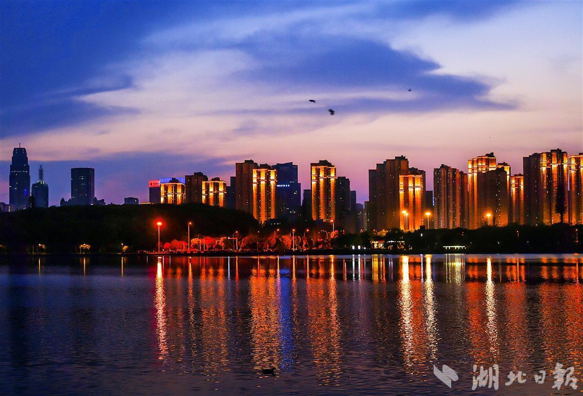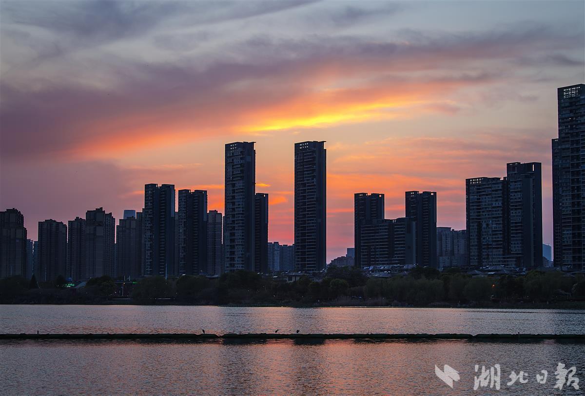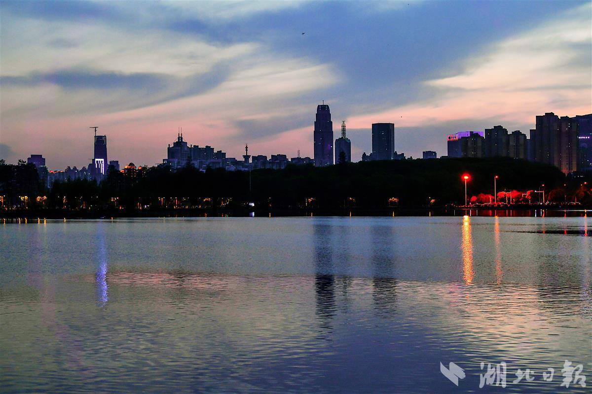 4月5日傍晚,武汉东湖上空出现久违的晚霞。只见东湖面碧波荡漾,绿道上微风轻拂,灿烂晚霞与城市霓虹相辉映,好一幅天然画卷。当日,武汉晴空万里,温度11至23℃,西南风3-4级转南风1级。(湖北日报全媒记者 朱熙勇 摄)