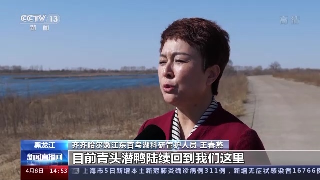 齐齐哈尔嫩江东百鸟湖科研管护人员 王春燕:去年3月末,有20余只青头潜鸭飞抵百鸟湖。今年经过科研人员观察,目前青头潜鸭陆续回到我们这里,数量增加到了50余只,比去年增加一倍之多。