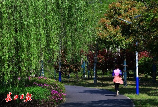 户外阳光下有了夏天的感觉,市民在花红柳绿的湖边散步、锻炼,享受家门口的美景。 长江日报记者李永刚 摄