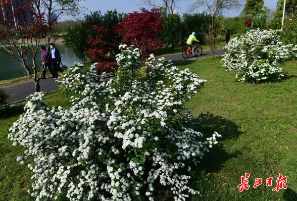 近日武汉天气晴好,气温快速升高,金银湖环湖绿道上,琼花绽放。 长江日报记者李永刚 摄