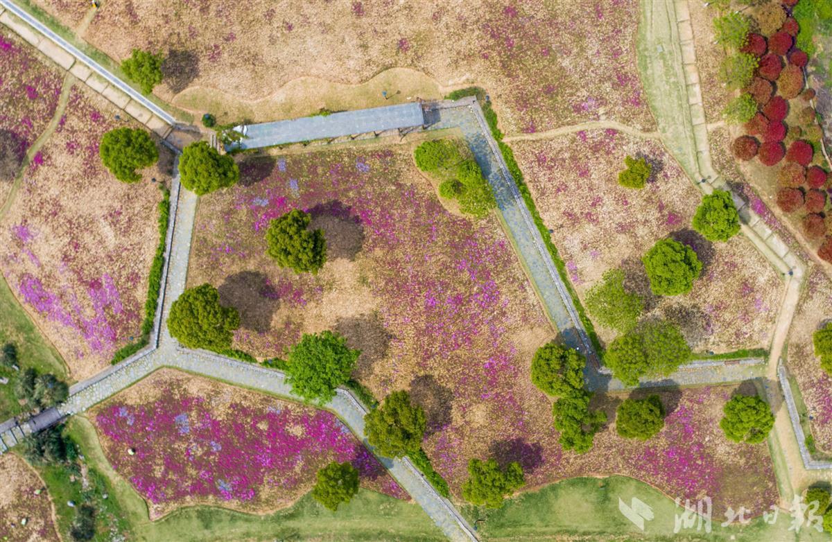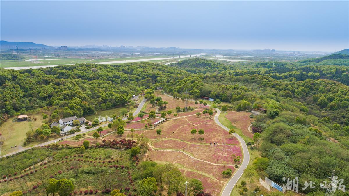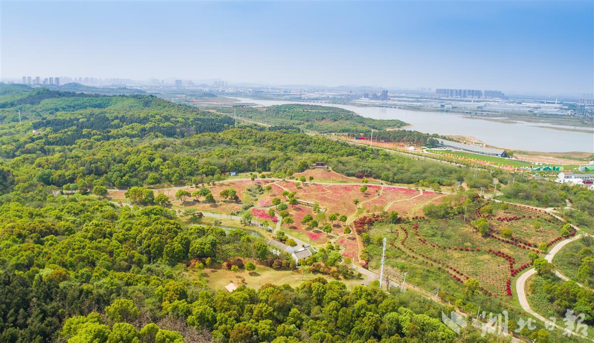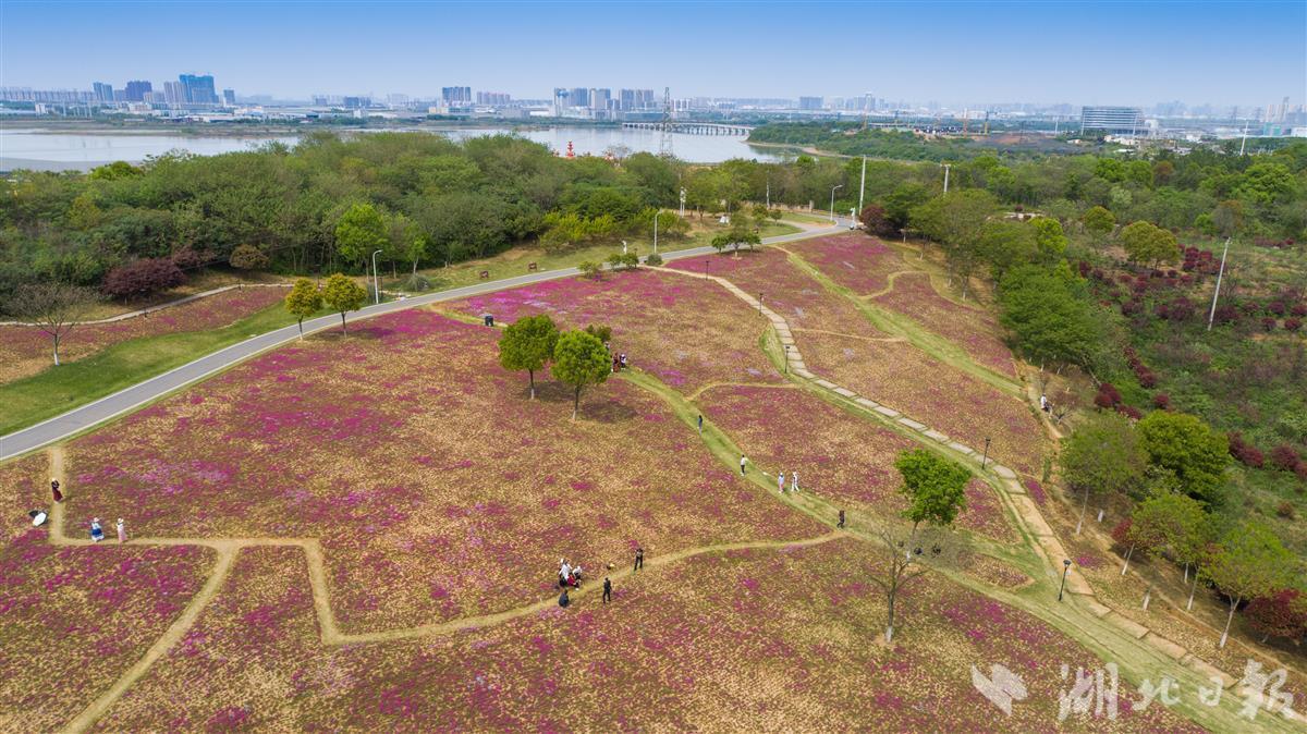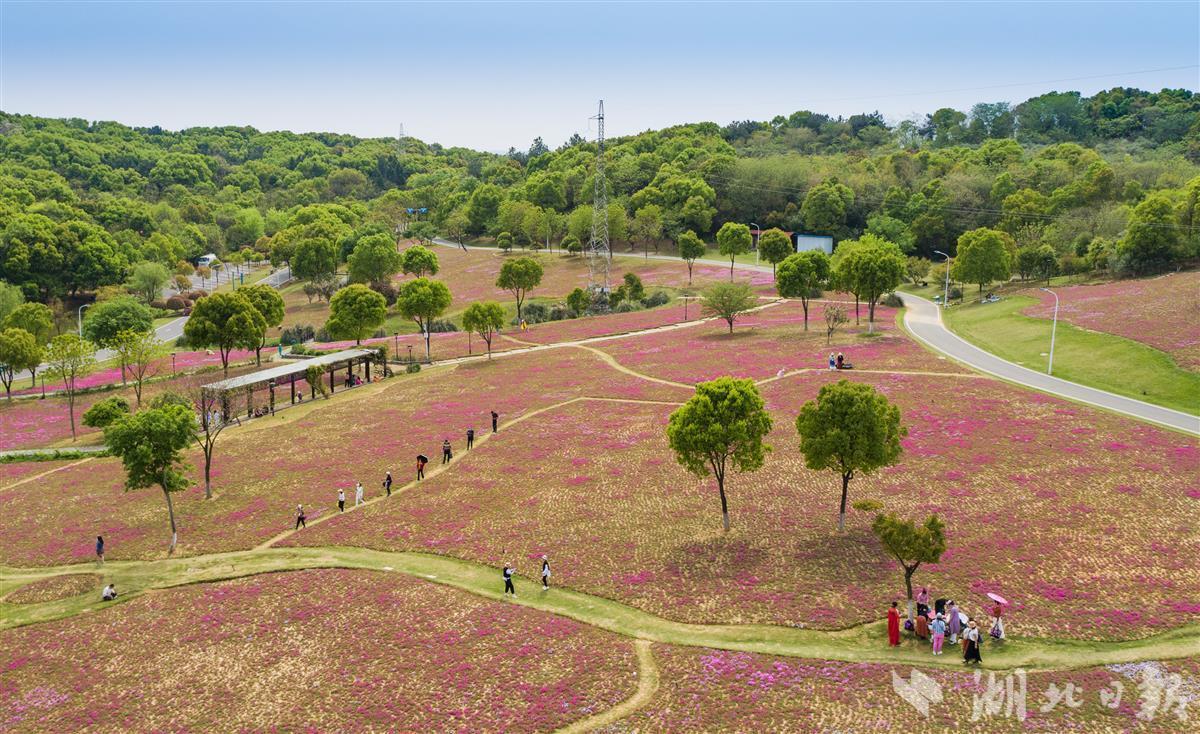4月6日,武汉经开区龙灵山生态公园,市民在十里花坡景区芝樱花海中游玩。龙灵山曾经是一片废弃矿坑,从2013年起,武汉经开区对军山地区的山体进行综合治理,停采闭坑,修复山体,植树造林。同时,该区投资1.37亿元修建了龙灵山生态公园。如今的龙灵山生态公园已成为武汉市内最大的生态公园,2021年7月顺利通过国家4A级旅游景区质量景观评审。(湖北日报全媒记者 柯皓 摄)