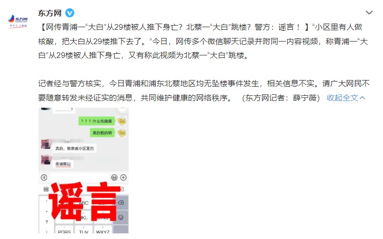 记者经与警方核实,今日青浦和浦东北蔡地区均无坠楼事件发生,相关信息不实。请广大网民不要随意转发未经证实的消息,共同维护健康的网络秩序。 (东方网记者:薛宁薇)