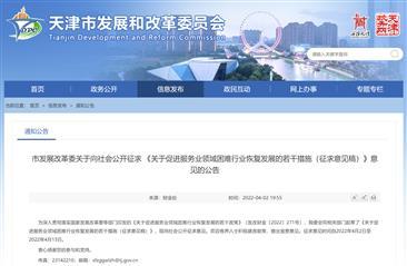 近日,天津市发展改革委会同相关部门起草了《关于促进服务业领域困难行业恢复发展的若干措施(征求意见稿)》(以下简称“征求意见稿”),自4月2日至4月13日向社会公开征求意见。