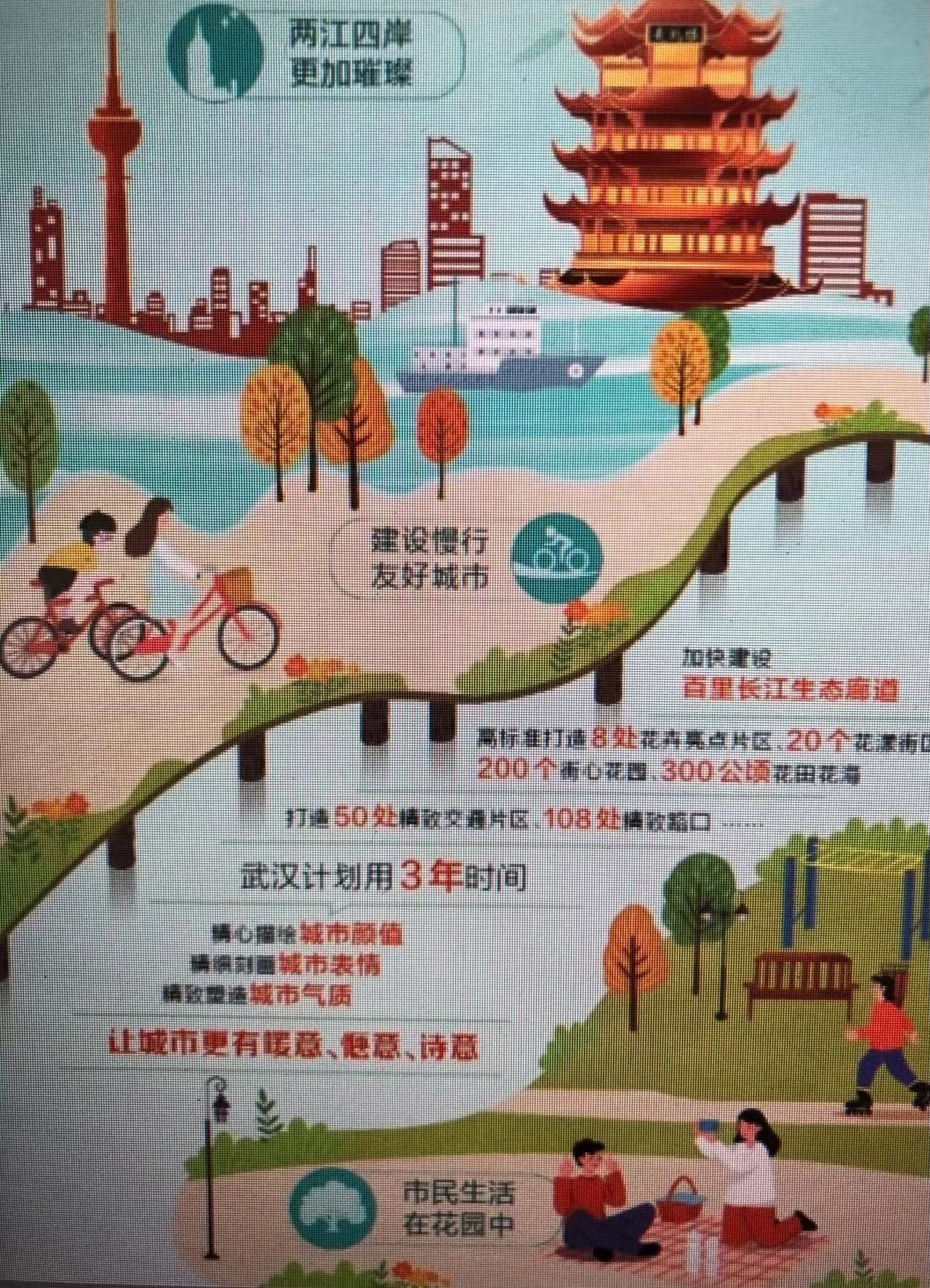 建设两轴(东西山系、长江主轴)、三片(环汉口、环武昌、环汉阳)、六线(木兰休闲、红色问津、沃野平川、湿地花田、江夏野趣、智慧活力)穿城绿道