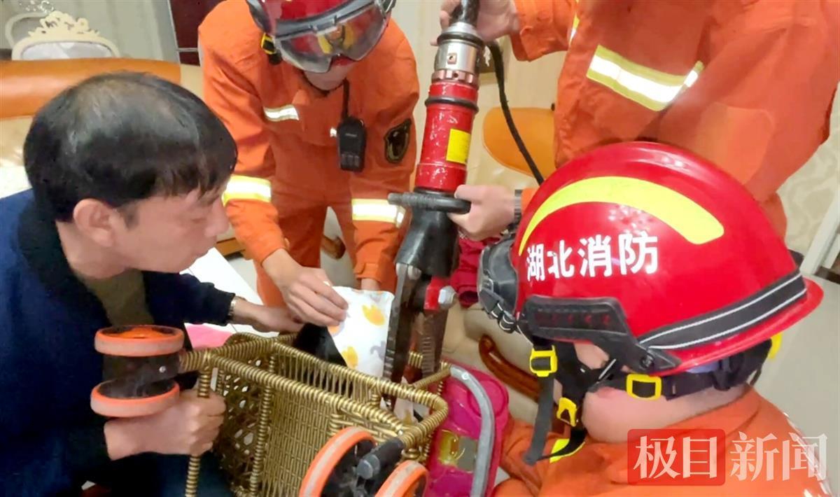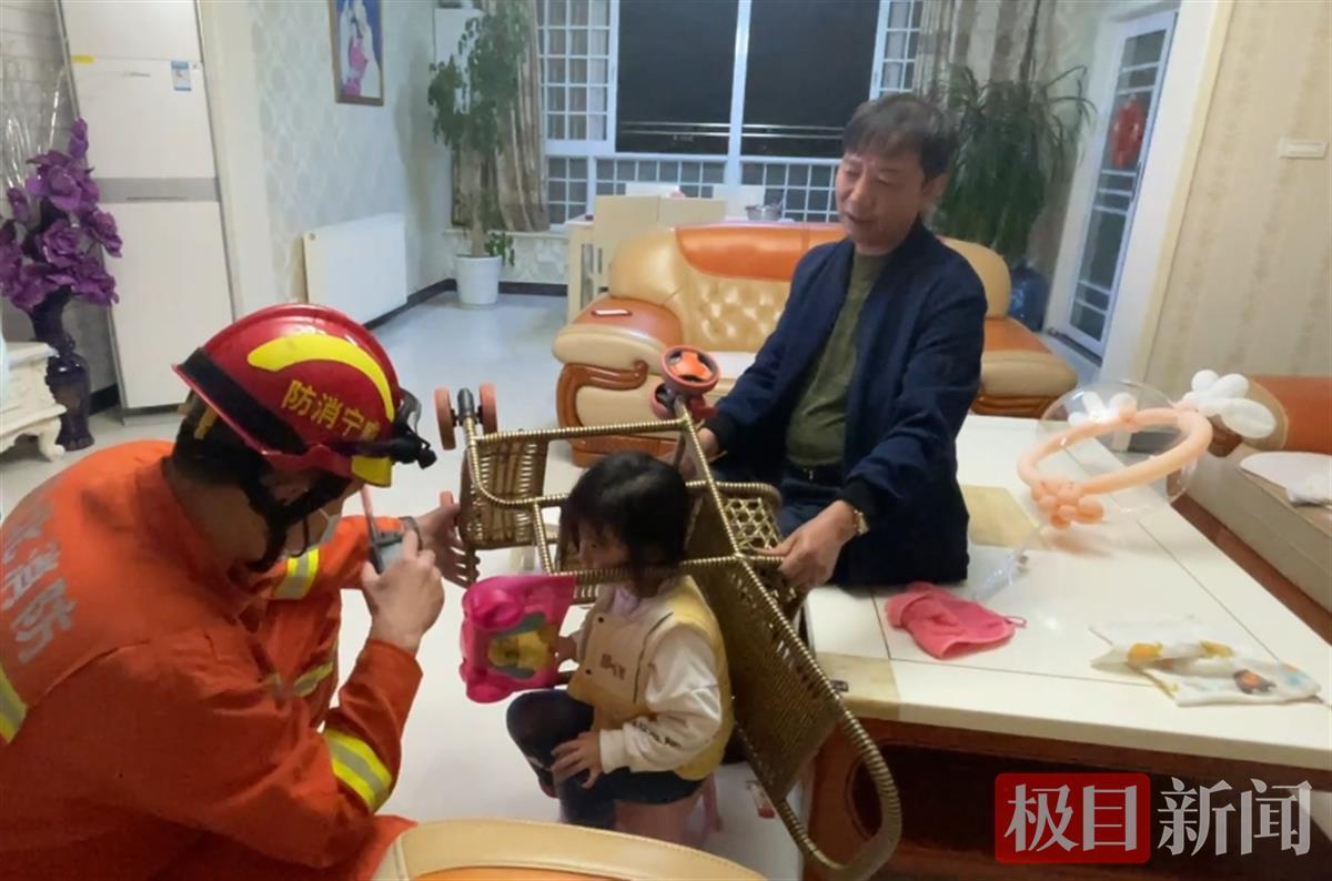 20时15分,消防救援人员到达现场后,发现一名3岁女孩头部被卡在儿童手推车的把手之间。据孩子爷爷奶奶介绍,一家人在客厅看电视,孩子便在一旁的儿童车内玩耍,起初孩子还好好的,一转眼竟将头卡入了儿童手扶小推车扶手缝隙处。然而用尽方法也无法将头部从缝隙处取出,遂拨打119报警电话寻求帮助。