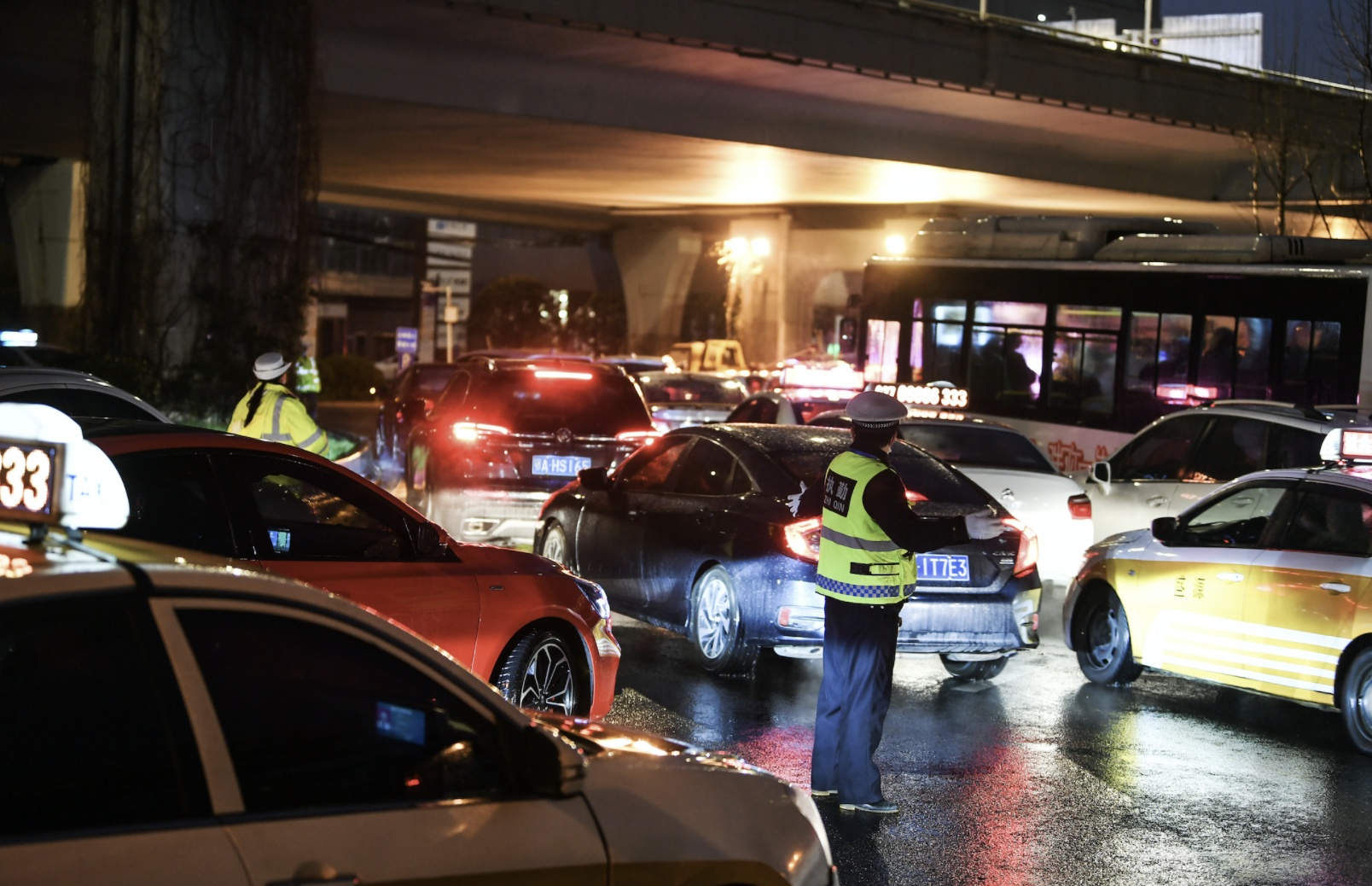 3月21日晚高峰,竹叶山转盘,交警在疏导车流。 记者史伟 摄