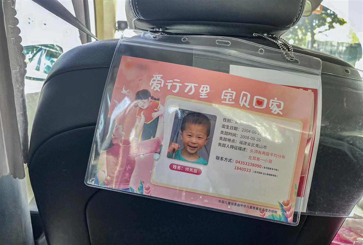 4月8日,极目新闻记者在一网约车上看到,驾驶员座位后挂着一个文件袋,里面装着中华儿童慈善总会授权的失踪儿童信息:修隽磊,2004年6月11日出生,2008年8月26日在福建武夷山市,并附有孩子的照片和联系电话。一辆辆网约车载公益广告,正助力失踪儿童早点回到父母身边。