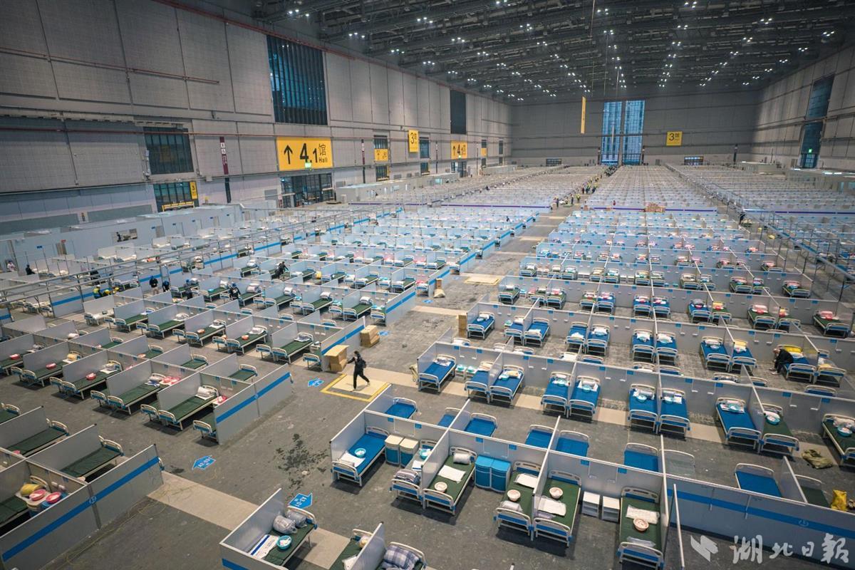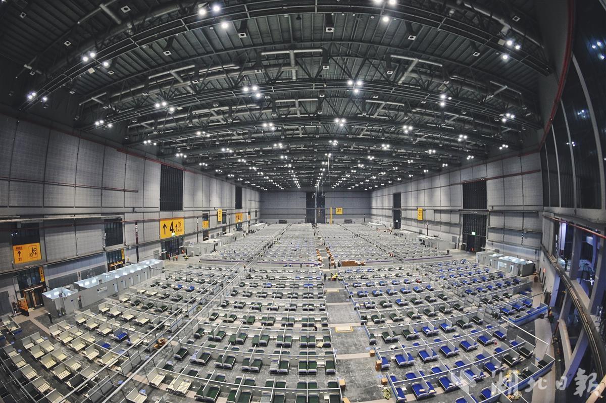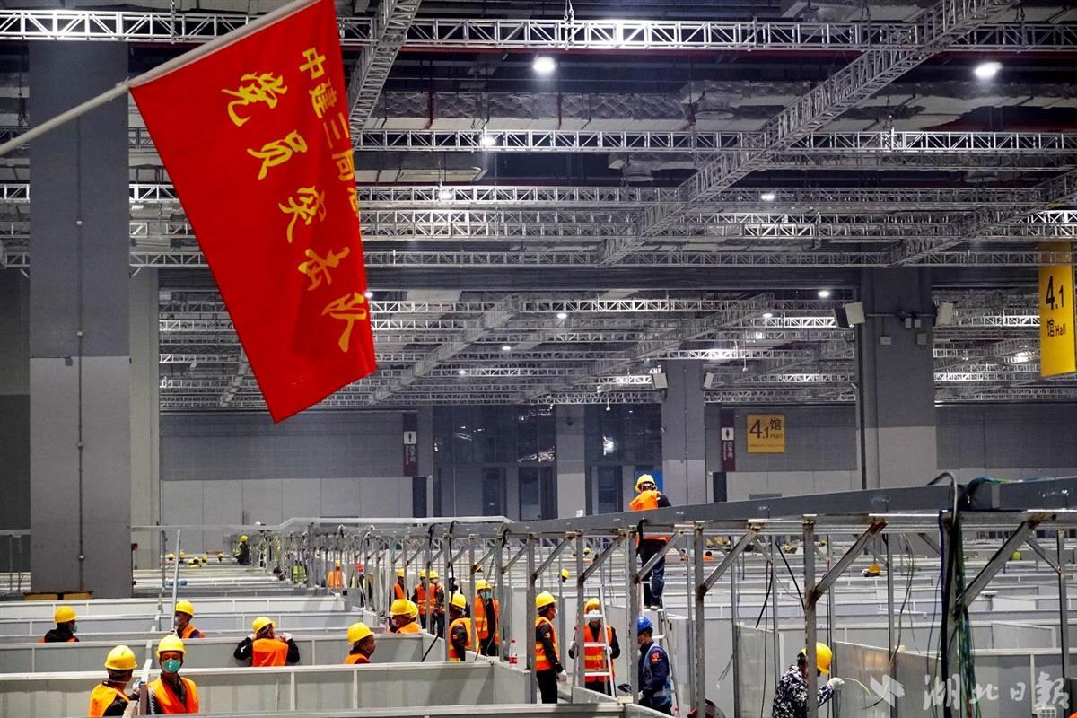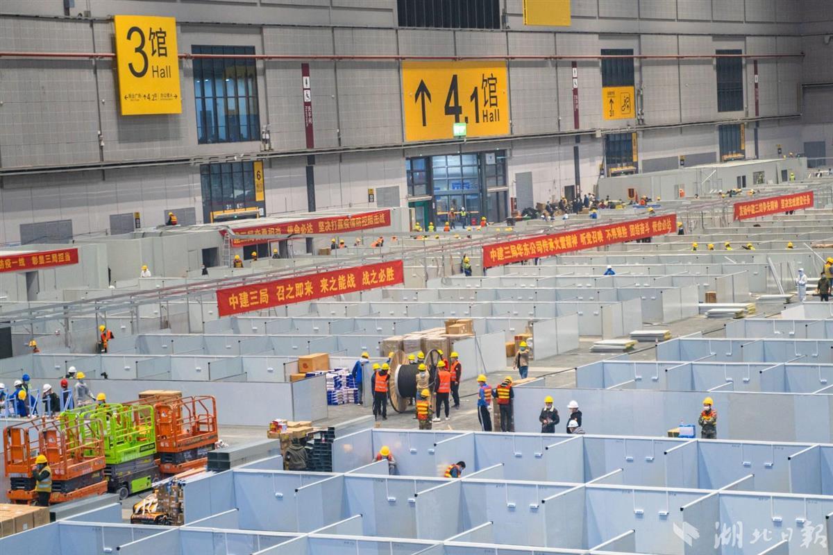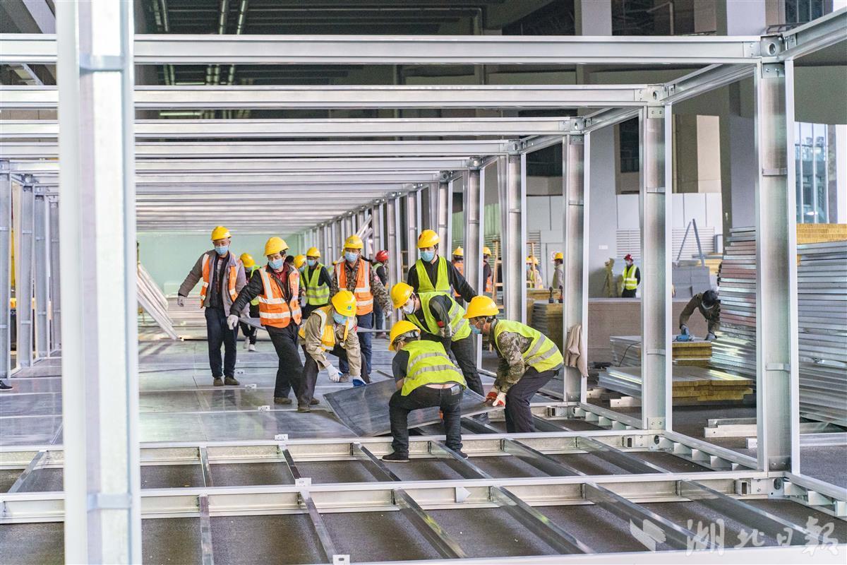 4日晚,指挥部通宵为350余辆货车办理通行证;5日10点,首批病房区隔断顺利进场;5日13:00,60台大型机械陆续进场;5日晚,1000名工人进场,隔断施工大面积展开;6日上午,2.6万平方米场馆,大部分隔断施工完毕,现场一夜“换装”……