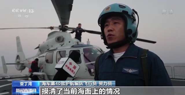 海军第40批护航编队飞行员 贺力员:飞行期间,我们对整个编队的航线前方及周边进行了全面搜索,摸清了当前海面上的情况,为编队下一步行动提供了有力的依据,同时也检验和提高了舰载机遂行护航任务的能力。