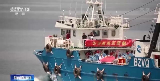 护航途中,远洋渔船还在驾驶室外挂出“感谢祖国海军为我护航”和“为祖国海军骄傲”字样的横幅。其间,船员们纷纷展开五星红旗,向护航编队挥手致意。