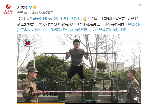 近日,中部战区陆军某“飞虎师”战士张勃强,以3小时21分19秒完成1001个单杠卷身上,再次突破自我!