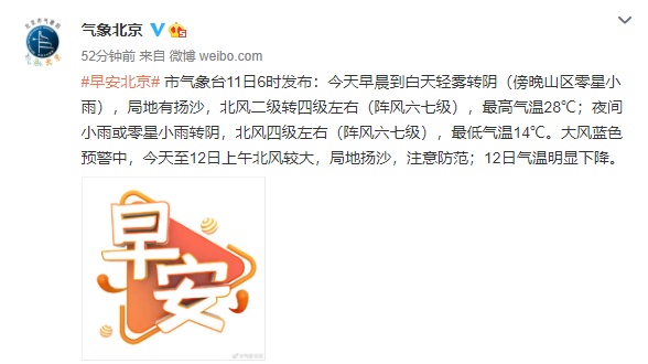 北京市气象台11日6时发布:今天早晨到白天轻雾转阴(傍晚山区零星小雨),局地有扬沙,北风二级转四级左右(阵风六七级),最高气温28℃;夜间小雨或零星小雨转阴,北风四级左右(阵风六七级),最低气温14℃。大风蓝色预警中,今天至12日上午北风较大,局地扬沙,注意防范;12日气温明显下降。
