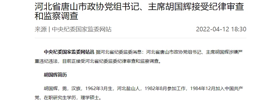据河北省纪委监委消息:河北省唐山市政协党组书记、主席胡国辉涉嫌严重违纪违法,目前正接受河北省纪委监委纪律审查和监察调查。