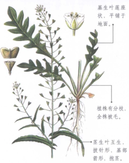 又名护生草,植株有分枝,全株被毛,基生叶莲座状,平铺于地面,总状花序顶生,花有小柄,白色。