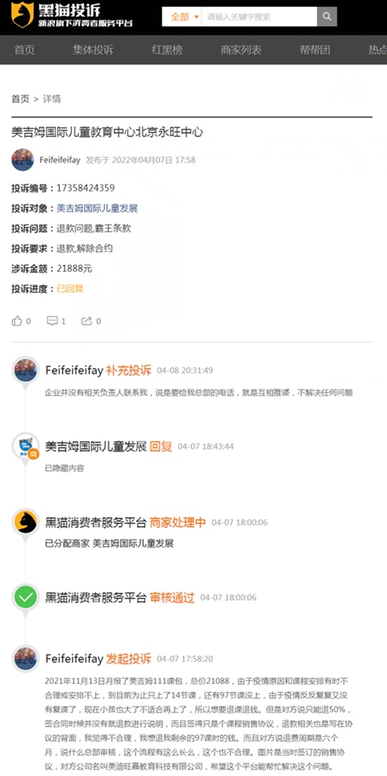 在黑猫投诉上,类似的投诉也不少。有消费者近日投诉北京一家美吉姆:2021年11月13日报了美吉姆111课包,总价21088元,由于疫情原因和课程安排等原因,到目前为止只上了14节课,还有97节课没上,由于疫情反反复复,现在小孩也大了不适合上了,所以想要退课退款,但是对方说只能退50%。