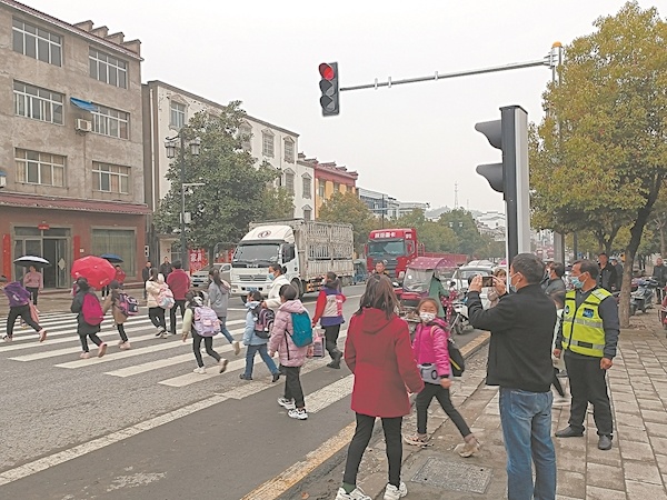 楚天都市报极目新闻讯(记者关前裕 通讯员张伟 李贞贞 杜江)4月11日上午11时20分,正值丹江口市土关垭镇小学放学时间。该校校长陈宏传将位于校门口316国道旁的交通信号按钮轻轻一按,国道上的信号灯由绿色变成红色,人行横道旁的信号灯变成绿色,等候在路边的学生快速有序通过人行横道。