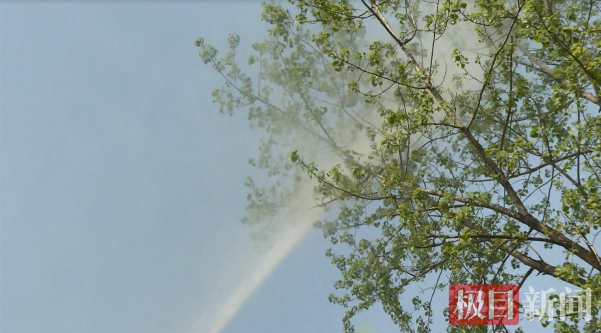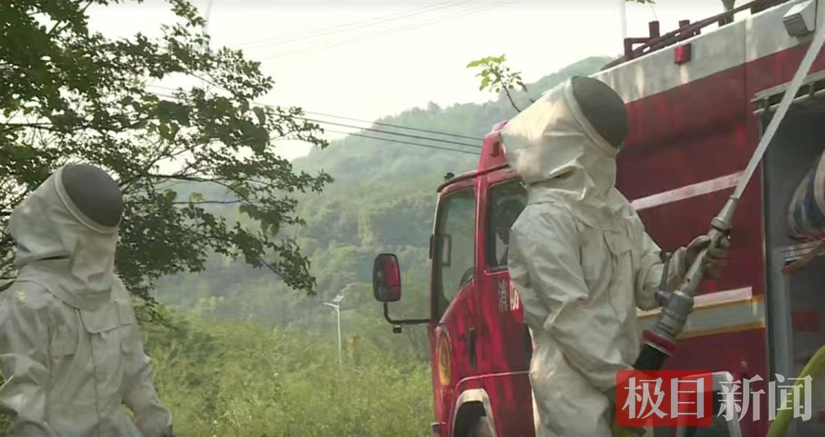 因马蜂窝筑巢在树顶上,上树摘马蜂窝不安全,消防指挥员下令,由两名经验丰富的消防人员穿好防蜂服做好保护措施后,采用消防水枪对马蜂窝进行冲击的水攻法,将马蜂窝冲碎,经过10分钟的处置,马蜂窝被消防水枪的水柱冲成碎片掉在路上,消防员对路上马蜂窝进行清理。