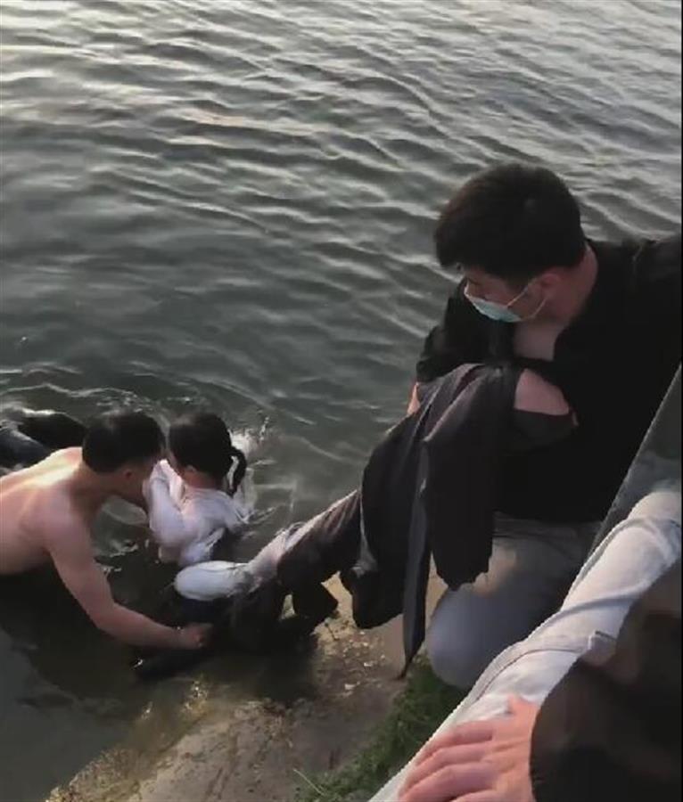 刘先生介绍,当时跳河女子已经离岸数米远,蓝衣大哥下水后,将女子往岸边拉。而岸上两位青年也将自己的外套脱下,把衣袖打结,当成绳子甩下河,最终在大家的合力救援下,该女子被成功拉上岸。