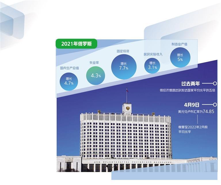 整体而言,在过去的两年里,俄经济增速是发达国家平均水平的五倍。俄罗斯在2021年主要以基础设施建设、改善民众生活等有针对性的举措支持国内经济复苏。同时,改善公民的生活质量和福祉一直是并且仍然是政府的绝对优先事项,为此实施了养老金指数化和支持困难家庭及单亲家庭等系列措施。此外,面对疫情冲击,俄政府与议会协调行动,大幅提高制定反危机措施的效率。数据显示,2021年俄国内生产总值增长4.7%,失业率创新低,达4.3%,投资和居民实际收入均有所增长,涨幅分别为7.7%和3.1%,制造业产值增长了5%。