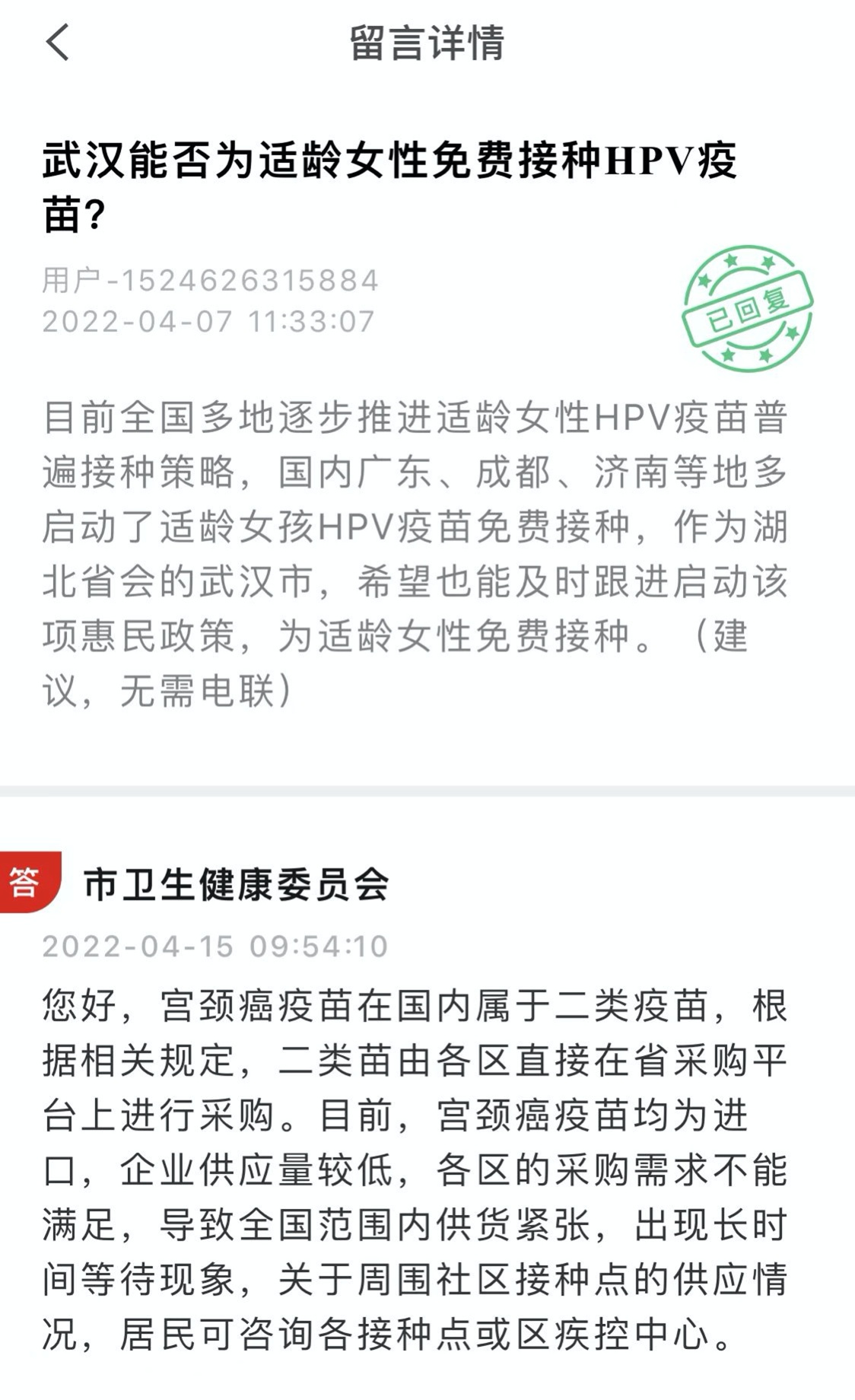 对于网友的建议,市卫健委回复表示宫颈癌疫苗在国内属于二类疫苗,根据相关规定,二类苗由各区直接在省采购平台上进行采购。目前,宫颈癌疫苗均为进口,企业供应量较低,各区的采购需求不能满足,导致全国范围内供货紧张,出现长时间等待现象,关于周围社区接种点的供应情况,居民可咨询各接种点或区疾控中心。