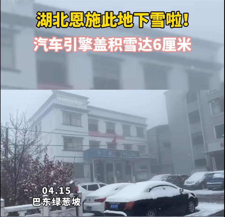 受寒潮影响,4月14日晚,湖北巴东绿葱坡镇开始降雪。截止4月15日上午11时,该镇气温已降至零下,道路被冰雪覆盖,部分车身积雪达6厘米。