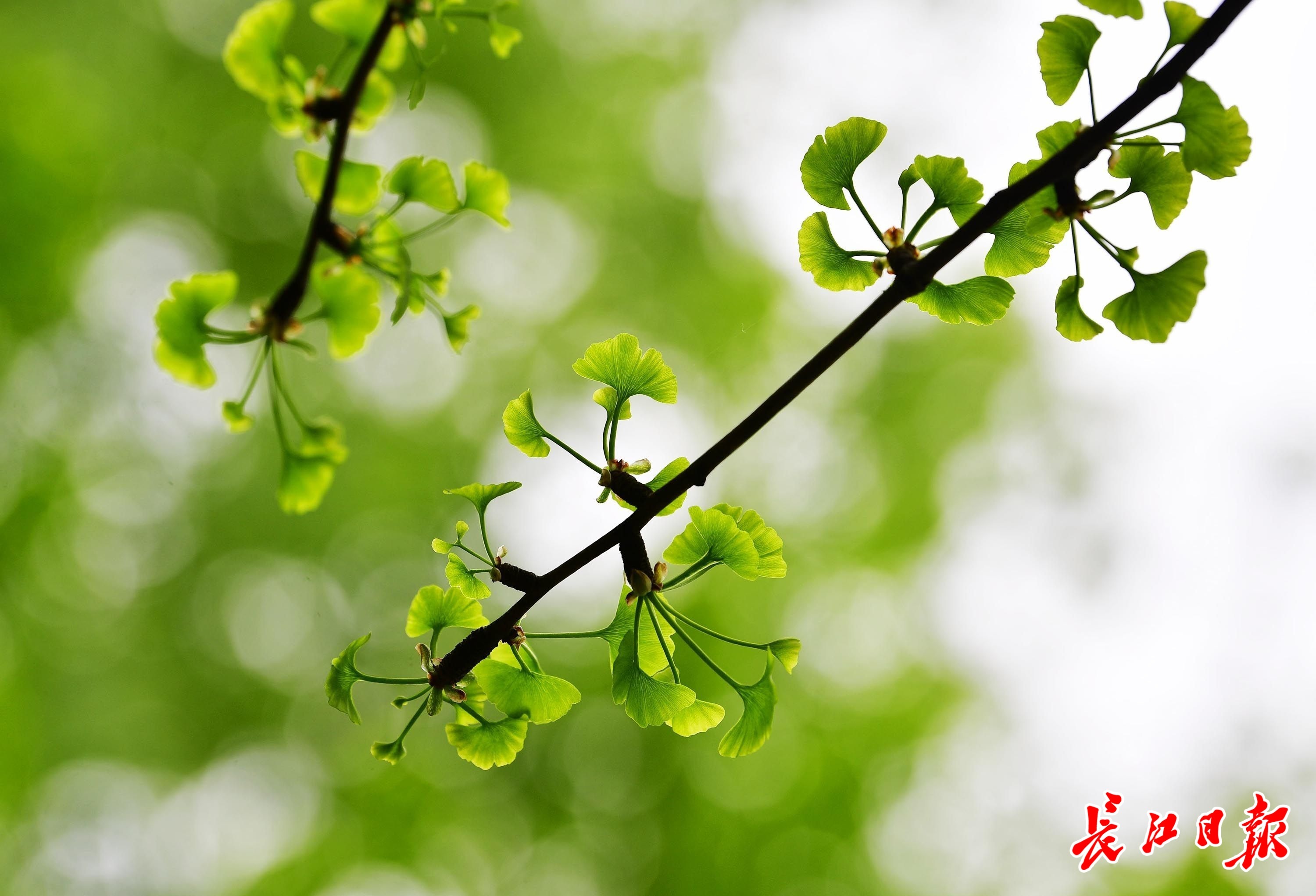 银杏的新叶如一簇簇花朵绽放枝头。