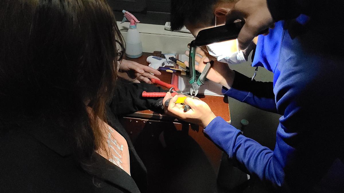 由于女子手掌受伤严重,若使用切割机可能会对手掌造成二次伤害,消防员使用剪切钳对戒指进行剪切,在剪开一条裂缝后,再用两把钢丝钳将戒指扯断。