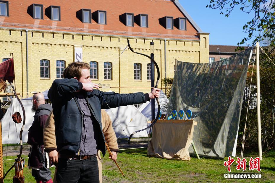 当地时间4月16日,2022年“复活节骑士节”在德国柏林施潘道城堡内举行,吸引众多游客前往。图为游客体验射箭。 中新社记者 马秀秀 摄