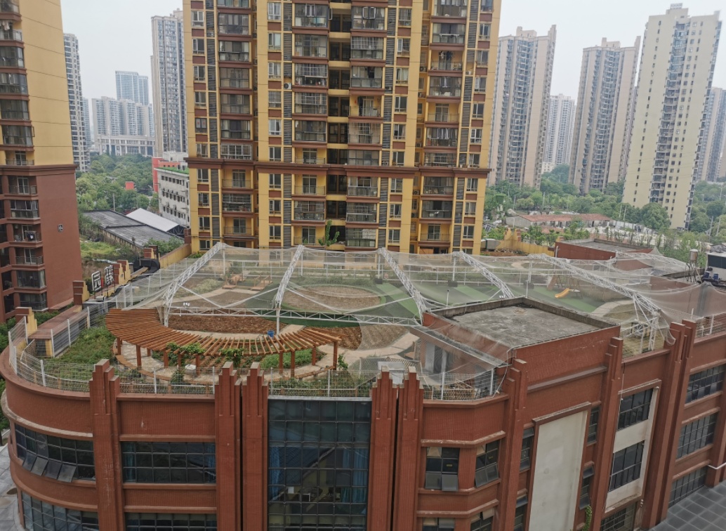 蒲园国际蒙台梭利儿童之家楼顶平台架设了大片防护网,设置有活动空间和菜园,居民称孔雀就养在防护网内。长江日报记者孙笑天 摄