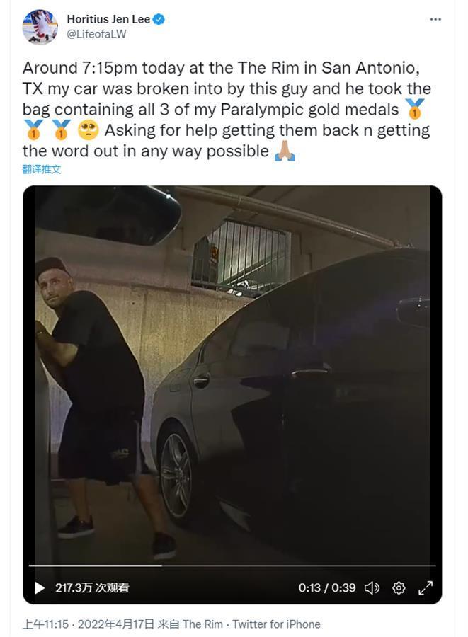 李在推文中说:“今天晚上7时15分左右,在得克萨斯州圣安东尼奥,我的车被这个人闯入了,他拿走了我的包,里面装有我全部的3枚残奥会金牌……”