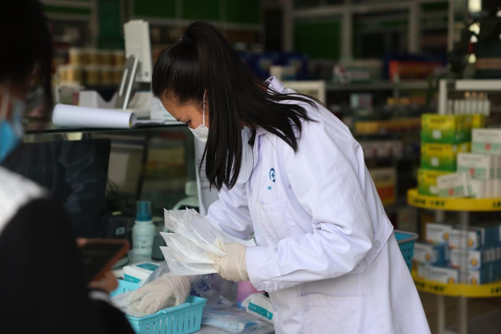 “市民购药前必须出示行程码和健康码,不能入店,取药、结账由我们协助完成。目前现金支付、电子支付和医保卡支付均可正常使用。”药店工作人员裴明丽介绍,根据政策安排,药店于17日恢复营业,“店内药品、防疫物资储备充足,今天开到晚上7点,满足居民的购药需求。”