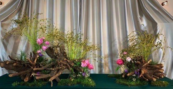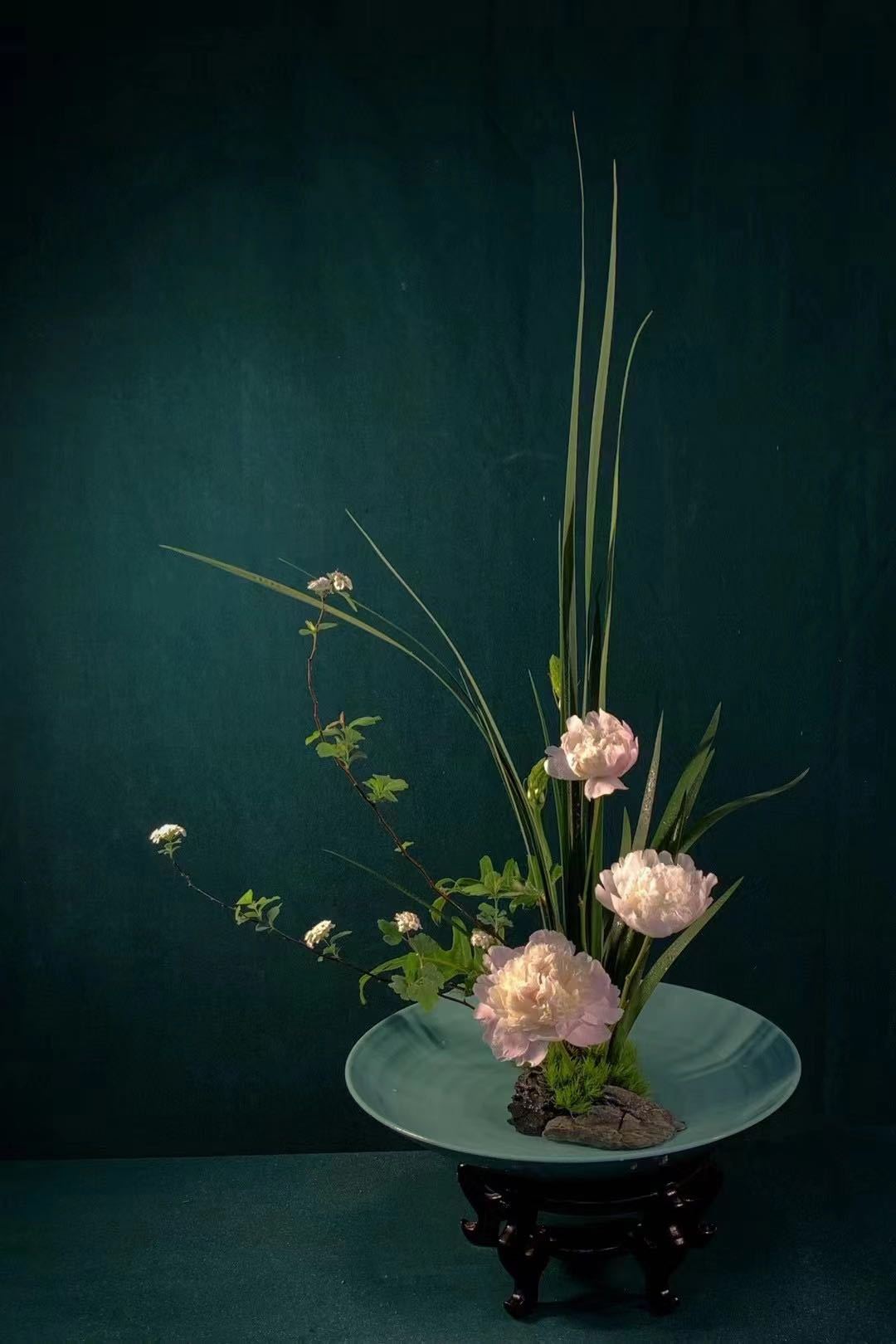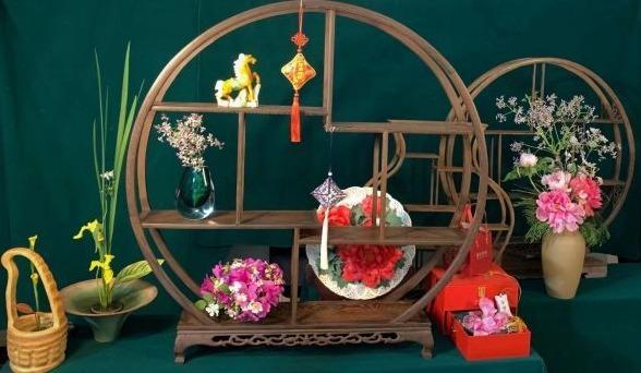 华中农业大学教授王彩云、秦仁强等合作的四件作品均以牡丹为主花。其中《谷雨恋歌》以三个博古架组合,瓶花中散插着牡丹、酴醾、楝花等植物,盘花中简约的鸢尾、小品花盛开的杜鹃都现场采自幸福湾公园。配饰是公园职工制作的写有“幸福安康”的艾蒿小香包,还有家里婚礼用的糖果盒等……好一幅寓意雨生百谷、来年富贵的幸福湾公园“谷雨图”。