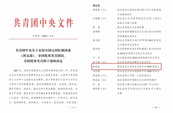长江日报大武汉客户端4月18日讯(记者杨枫 通讯员朱婕)近日,共青团中央印发《关于表彰全国五四红旗团委(团支部)、全国优秀共青团员、全国优秀共青团干部的决定》,湖北省武昌实验中学2019级高三(5)班学生帖宸铉荣获“全国优秀共青团员”荣誉称号,成为武汉市唯一获此荣誉的中学生。