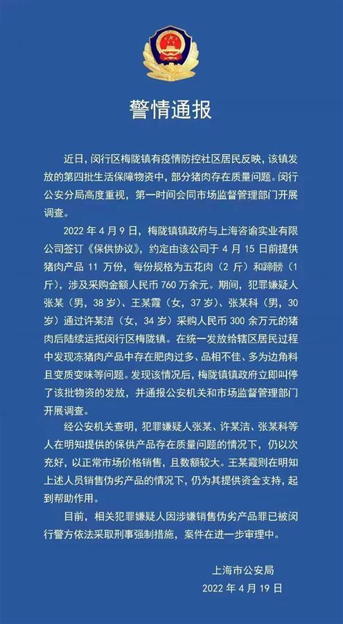 2022年4月9日,梅陇镇镇政府与上海咨谕实业有限公司签订《保供协议》,约定由该公司于4月15日前提供猪肉产品11万份,每份规格为五花肉(2斤)和蹄髈(1斤),涉及采购金额人民币760万余元。期间,犯罪嫌疑人张某(男,38岁)、王某霞(女,37岁)、张某科(男,30岁)通过许某洁(女,34岁)采购人民币300余万元的猪肉后陆续运抵闵行区梅陇镇。在统一发放给辖区居民过程中发现冻猪肉产品中存在肥肉过多、品相不佳、多为边角料且变质变味等问题。发现该情况后,梅陇镇镇政府立即叫停了该批物资的发放,并通报公安机关和市场监督管理部门开展调查。