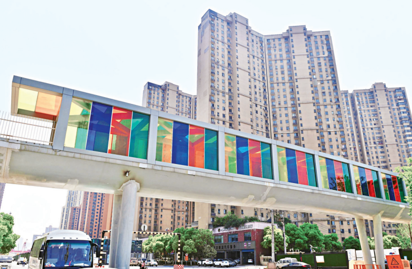 青山区园林路临江大道路口,一座镶嵌着彩色玻璃的天桥“横空出世”,像一道彩虹横跨在园林路上。与普通天桥不同的是,该桥的廊道两侧以及顶棚均安装有黄、蓝、橙、绿四种颜色的亚克力有机玻璃,在阳光下璀璨透亮。该桥预计今夏对市民开放。