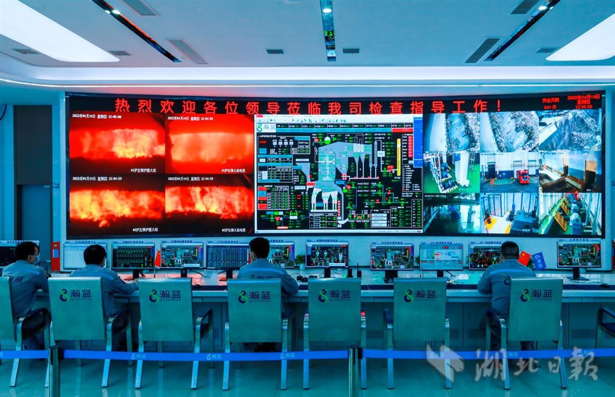 4月14日,在孝感市静脉产业园发电控制大厅,通过大屏幕可以看到生活垃圾被转运到锅炉熊熊燃烧后变成电能,输送到千家万户。