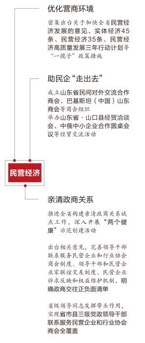 “亲”而有度,“清”而无忧。构建“亲清”共融的政商关系,是优化营商环境、凝聚发展合力的重要前提,也是激发内生创造力、促进“两个健康”发展的重要保障。山东坚持把构建亲清政商关系纳入省委常委会工作要点,纳入全省改革开放制度创新重要内容,纳入“担当作为、狠抓落实”重点任务,建立政企沟通协商制度,召开全省民营企业座谈会、省级山东商会会长座谈会、海内外商会会长座谈会等,推动政企沟通协商制度化开展、规范化运行。与此同时,扎实推进全省构建亲清政商关系试点工作,深入开展“两个健康”示范创建活动。出台相关意见,完善领导干部联系服务民营企业和行业协会商会制度、领导干部和民营企业家联谊交友制度、民营企业诉求反映和权益维护机制,明确政商交往正负面清单。省级领导同志发挥带头作用,实现省市县三级党政领导干部联系服务民营企业和行业协会商会全覆盖。