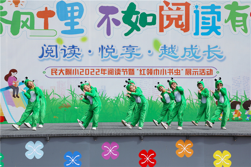 此次展示活动分为读书成果展演和作品展示两部分。在读书成果展演活动中,附小学子登上舞台诵读经典美文,吟唱书香经典,主要表演剧目有课本剧《小蝌蚪找妈妈》、红色故事朗诵《王二小》,经典诵读《梅兰竹菊》等。“忆江南!江南好,风景旧曾谙……”现场“虎小宝点诗”游戏颇受学生喜欢,师生对接诗句,附小学子集体诵读经典,抑扬顿挫的读书声响彻整个校园。各年级组还依次展示诗词吟唱,舞蹈、诵读、演唱等贯穿全场,阅读展示形式多样化,为全校师生献上了一场视觉盛宴。在展演活动上,还举行了图书漂流仪,让好书在班级间流动。