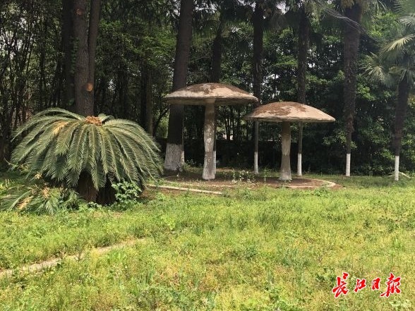 两个水泥“蘑菇”掩映在绿草丛中。 记者胡义华 摄