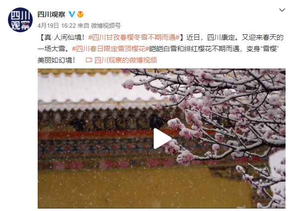 【真·人间仙境!四川甘孜春樱冬雪不期而遇】近日,四川康定。又迎来春天的一场大雪。皑皑白雪和绯红樱花不期而遇,变身“雪樱”美丽如幻境!