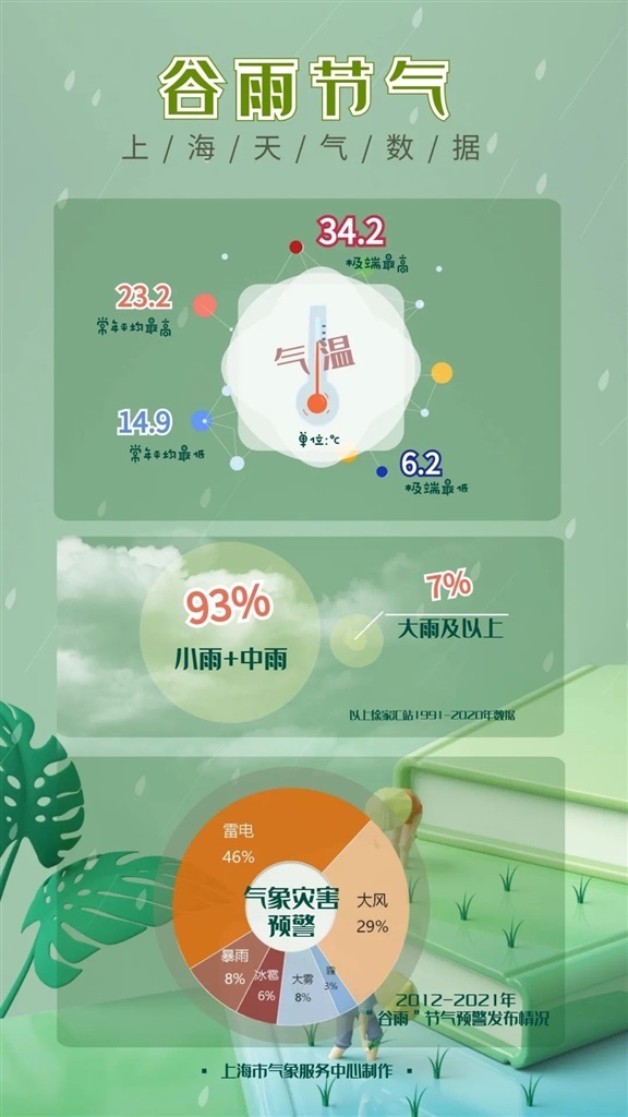 “谷雨”节气,上海通常为仲春,天气整体温暖。上海市气象局表示,徐家汇站近30年的数据显示,“谷雨”节气上海常年平均气温为18.5℃,常年平均降水量为41.8毫米。极端最高气温34.2℃(1997年),极端最低气温6.2℃(1991年)。