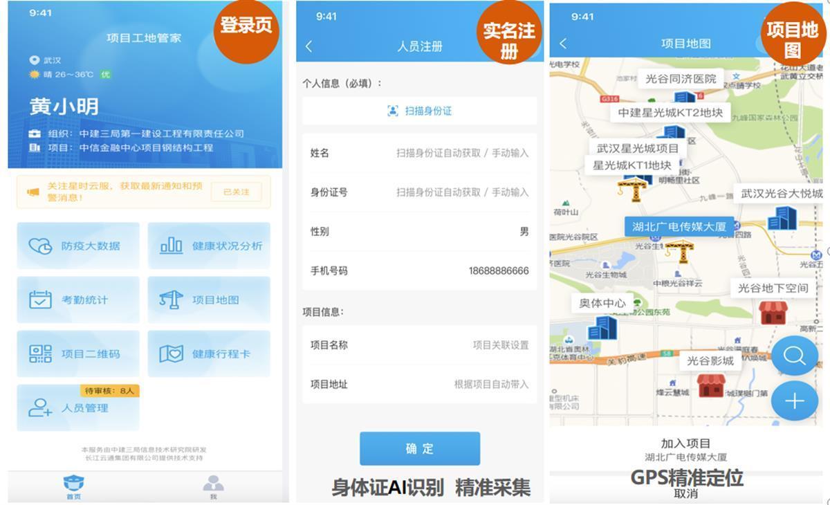 让老李得到解脱的是中建三局信息技术研究院自研的新一代工地人员健康管理系统——“工地卫士”。它实现了工地管理系统的多验合一,系统能自动测体温,人脸比对身份,检查健康码,记录下行程等,任何一项有问题,系统就会发出警告,极大地提升了工地人员进去管理的准确性和效率。