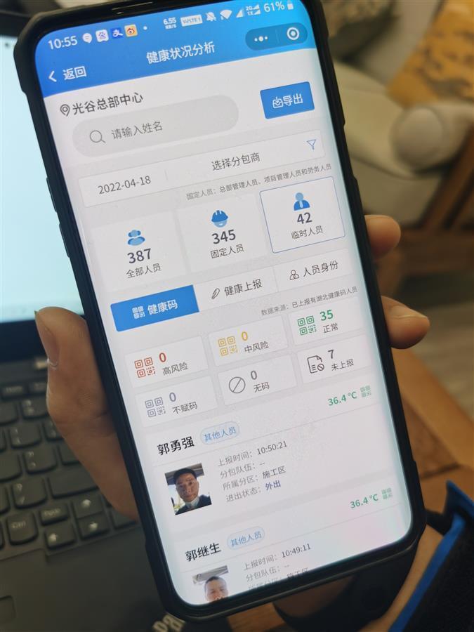 建筑工地施工企业往往不只一家,钢筋、模板、混凝土、精装修……涉及的工序工种繁杂、分包商众多,工地的流动人员管理一直是老大难。鄂旅投·光谷总部中心项目技术工程师黄亚北介绍,除去中建三局自有管理人员外,目前录入“工地卫士”的分包商就达到了38家,分包商的工人往往各成一队,需要时进场,工序完成后就迅速转战下一个工地,这还不包括每天要进出工地的货车司机、后勤人员和临时来访人员等。