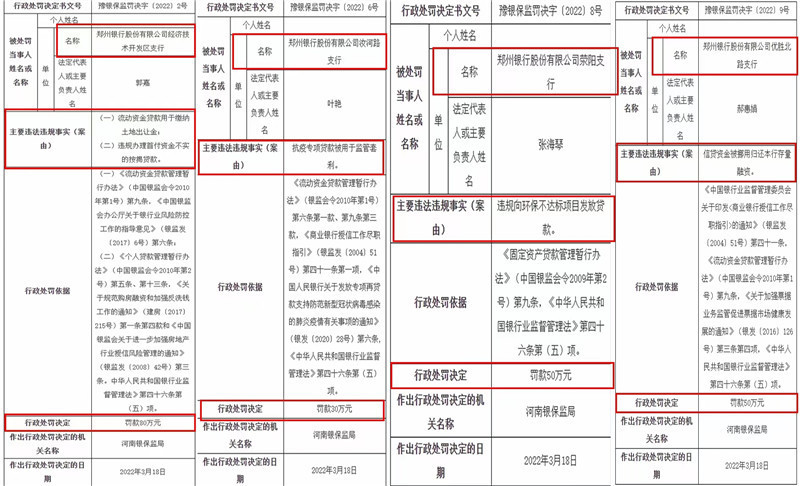 2022年3月末,河南银保监局公布《行政处罚信息公开表》(以下简称“《公开表》”),其中,连续8张《公开表》(豫银保监罚决字〔2022〕2号—9号)集中显示了对郑州银行旗下6个支行的处罚,被处罚问题涉及贷款被违规使用或挪用、违规办理按揭贷款等。