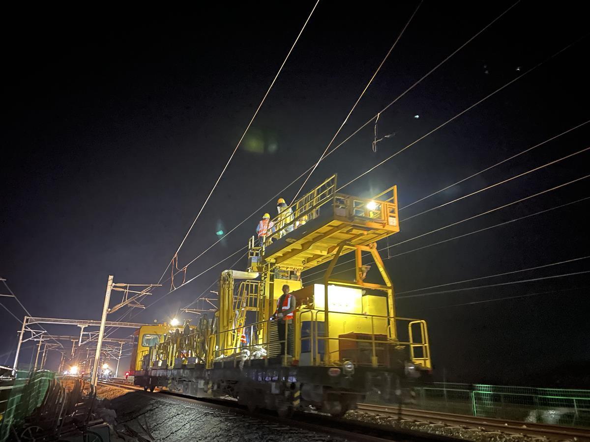 据介绍,项目施工中,先进的“接触网施工参数一体化测量装置”将北斗定位技术引入测量装置,将“中国北斗”和“中国高铁”两张国家名片深度融合。该装置基于北斗定位和红外扫描功能于一体,能简便、快速完成接触网支柱限界、基础高程、跨距、承力索高度、拉出值等参数的测量、记录及传输,使测量误差控制在“毫米级”,为后期腕臂、吊弦参数计算、安装提供精确数据。