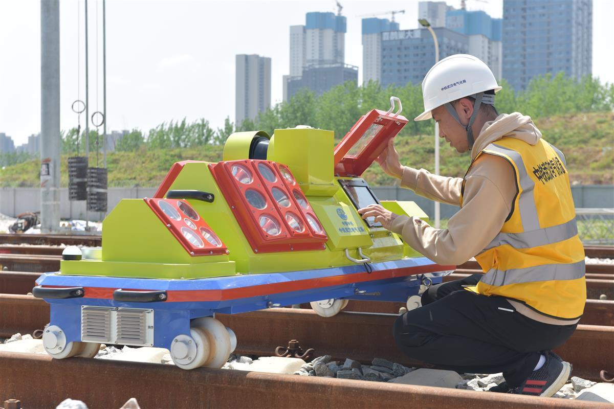 测量参数准确是第一步,攻关检测装置,打通精准施工的最后一公里。据介绍,中铁武汉电气化局研发的“便携式接触网智能检测小车”和“便携式接触网悬挂状态智能巡检装置”,在全线承导线架设施工完成后,对接触网悬挂各项指标参数实行动态检测、分析。检测小车对接触网几何参数进行检测的同时,对腕臂、吊弦、电连接等接触网零部件进行高清成像,根据采集图像自动识别缺陷,并形成缺陷报表,使接触网参数测量效率提高了80%,进一步全面提升了施工的精准度。